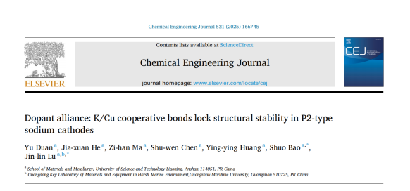 近日,米兰网页版材料与冶金学院包硕副教授联合广州航海学院(广州交通大学筹)路金林教授,以米兰网页版为第一署名单位,在国际知名期刊《Chemical Engineering Journal》(中科院1区top期刊,2025年影响因子:13.2)发表高水平研究论文《Dopant alliance: K/Cu cooperative bonds lock structural stability in P2-type sodium cathodes》(https://doi.org/10.1016/j.cej.2025.166745),第一作者为米兰(中国)官方入口2023级硕士研究生段玉。