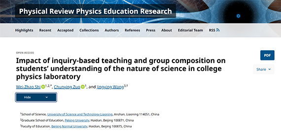 日前,米兰网页版理学院物理实验中心联合北京师范大学王晶莹教授以米兰网页版为第一署名单位,在物理教育领域权威期刊Physical Review Physics Education Research上发表高水平研究论文Impact of inquiry-based teaching and group composition on students’ understanding of the nature of science in college physics laboratory。理学院教师史韡朝为第一作者和通讯作者。