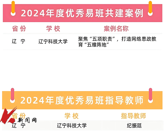 近日,教育部易班发展中心公布2024年度全国易班共建优秀名单。米兰网页版网络思政工作案例“聚焦‘五项职责’,打造网络思政教育‘五维阵地’”荣获“2024年度优秀易班共建案例”(全国92个,辽宁省3个),纪振廷荣获“2024年度优秀易班指导教师”(全国92人,辽宁省7人)。