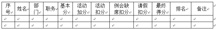 (10)每次例会前办公室对学生会全体成员进行一次综合打分,即汇总上周所有成员的活动及例会出勤情况并按上述规定进行打分,并于例会期间通报评比结果,并张榜公布。具体格式见下表,备注栏中应注明加减分原因。